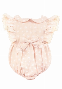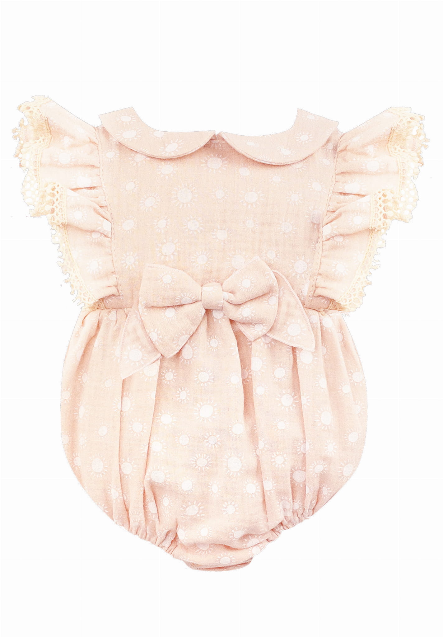 Rampers zdobią subtelne nadruki w słoneczka, które wprowadzają radosny, wakacyjny nastrój. Uroczy kołnierzyk, kokarda i drobna koronka nadają ubranku wyjątkowego, dziewczęcego charakteru – idealnego zarówno na co dzień, jak i na specjalne okazje.