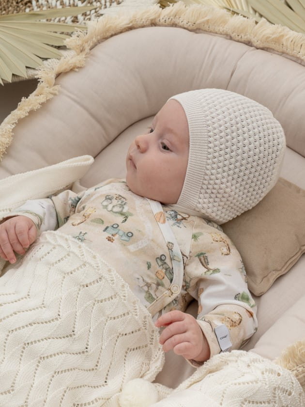 Bonetka jest wiązana pod szyją, co nie tylko dodaje uroku, ale także zapewnia pewne dopasowanie do głowy dziecka i zapobiega zsuwaniu się.