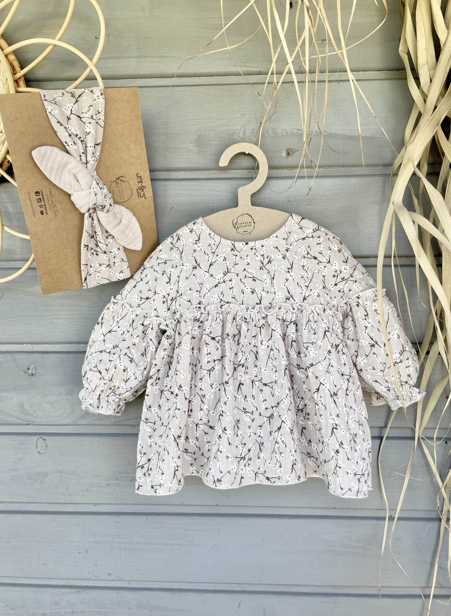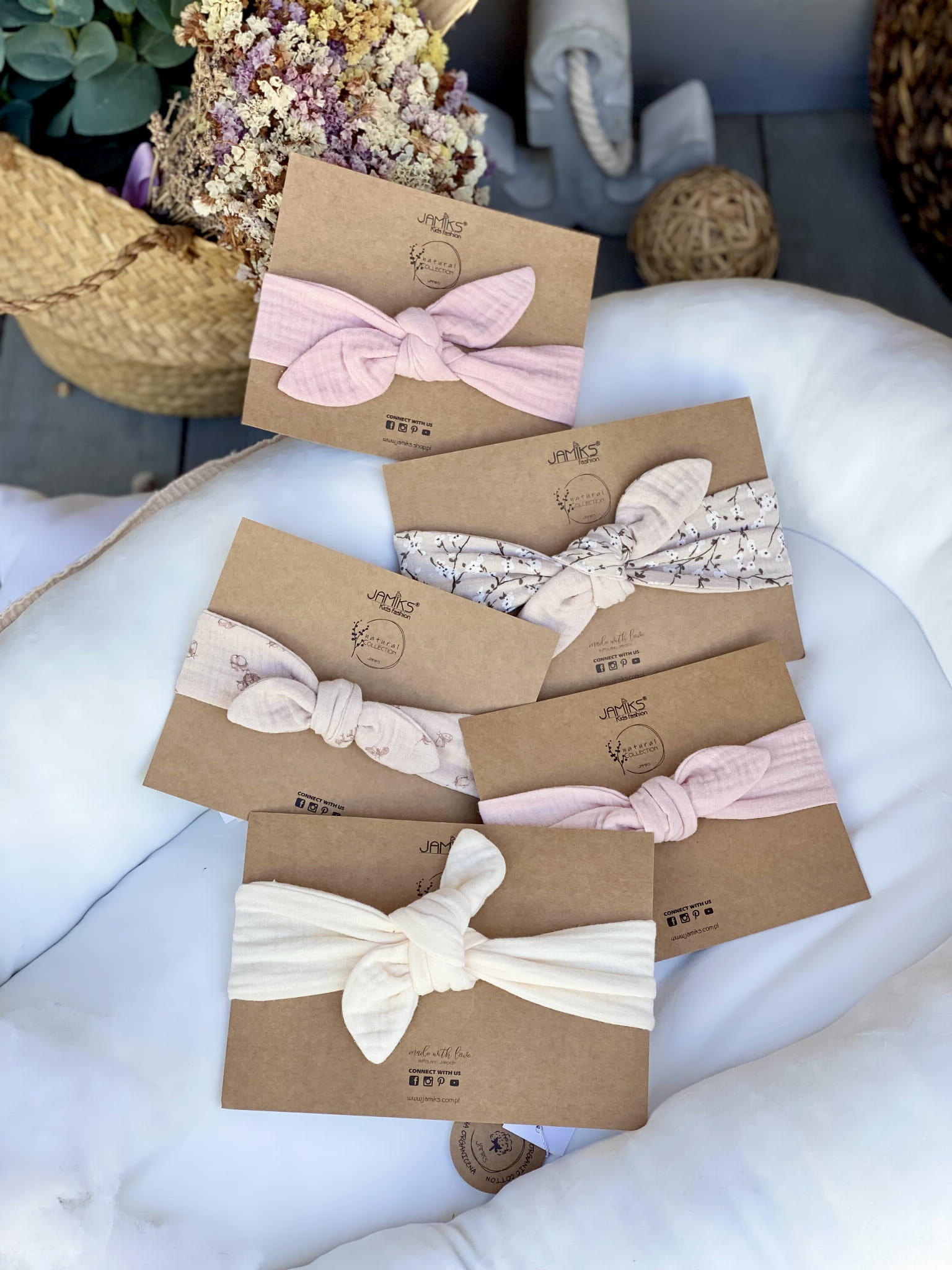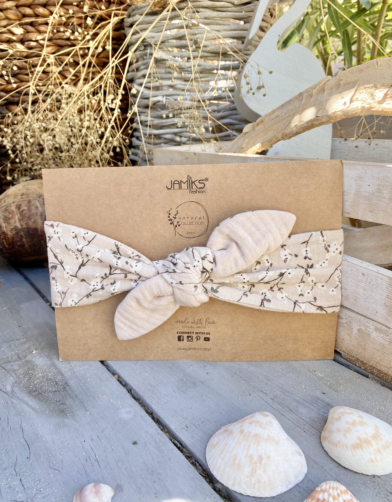 Urocza opaska z kokardą dla dziewczynki wykonana z muślinu.