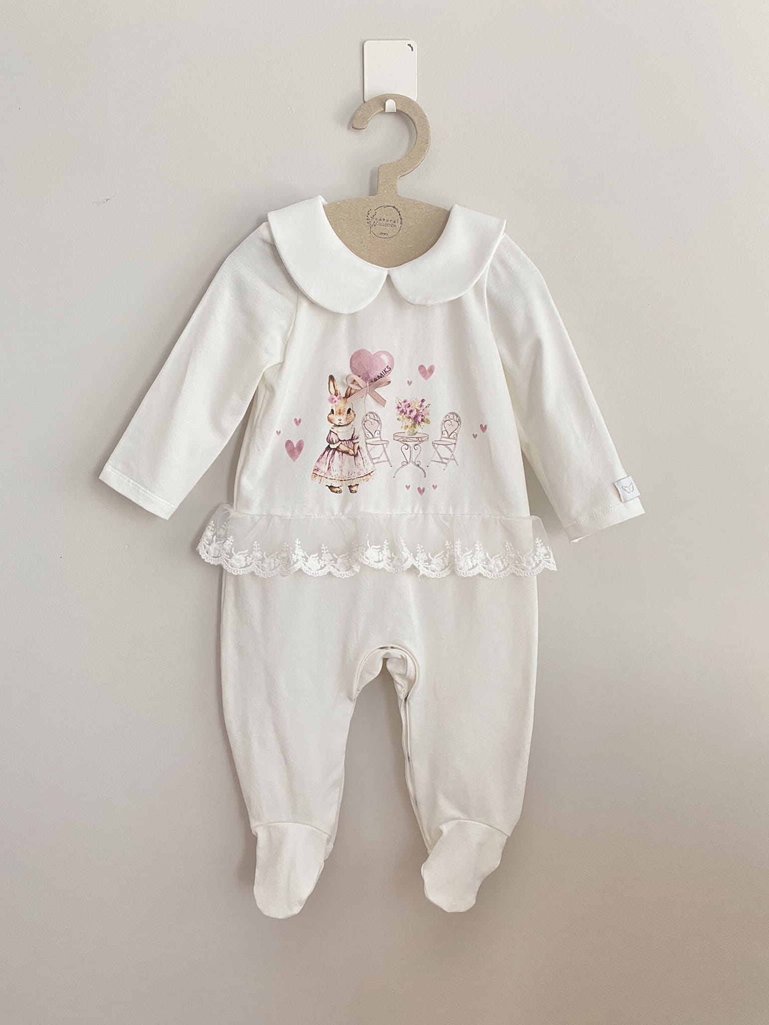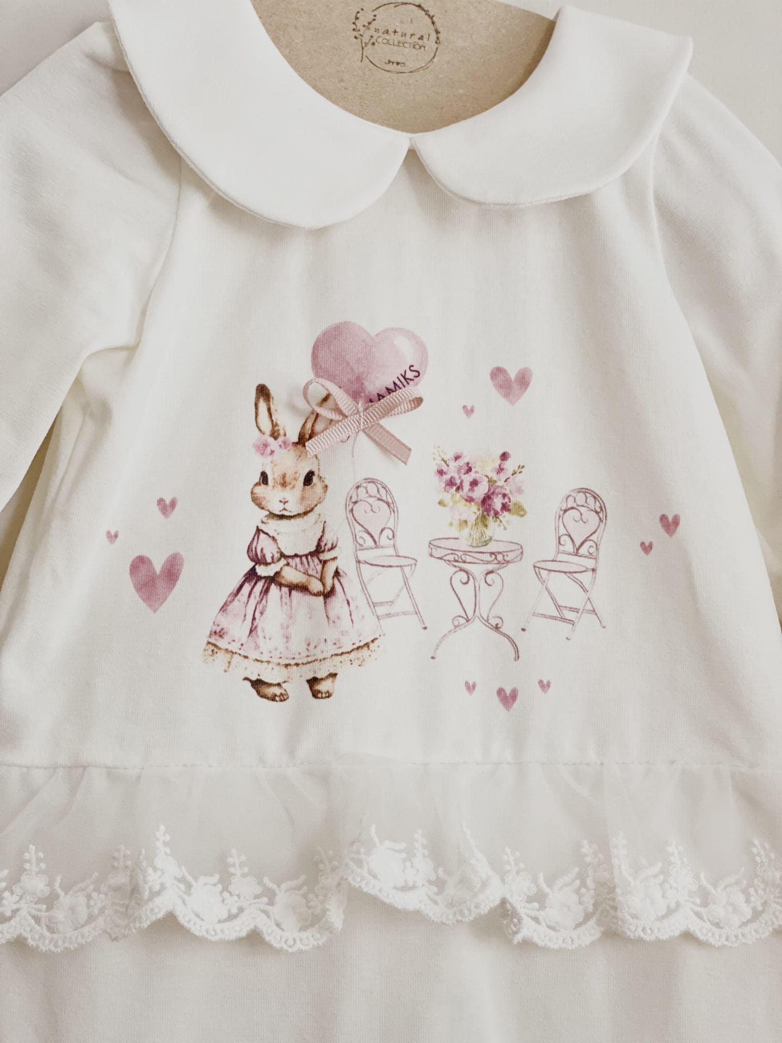 Pajacyk zdobi subtelna, dekoracyjna koronka oraz niepowtarzalny nadruk naszego autorstwa, dzięki czemu każde ubranko jest jedyne w swoim rodzaju i pełne uroku.