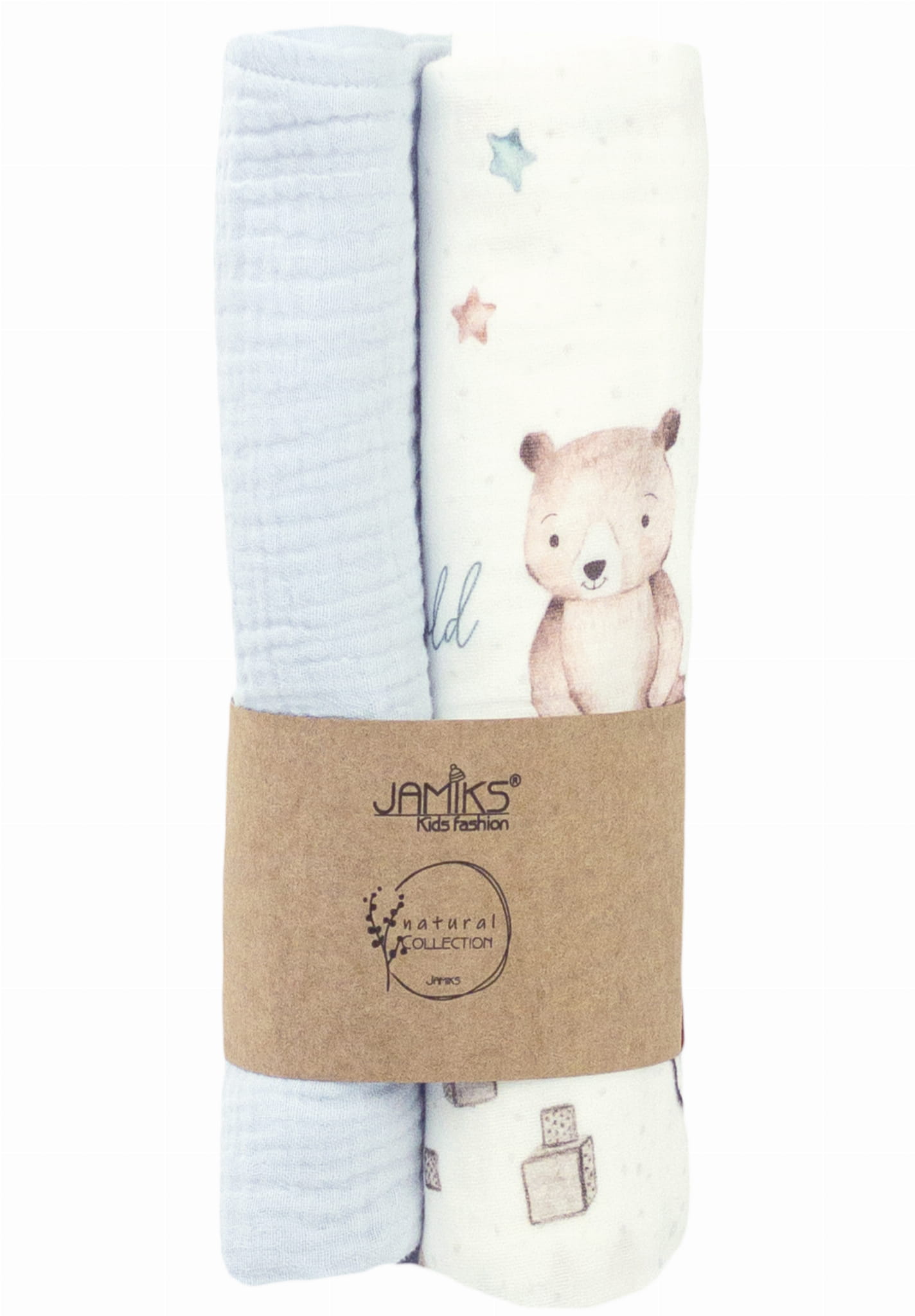 Jedna z pieluszek jest jednokolorowa, dzięki czemu może pełnić rolę klasycznej i uniwersalnej pieluszki, idealnej do codziennego użytku. Druga pieluszka jest ozdobiona uroczym nadrukiem, co nadaje jej dodatkowego uroku i może być atrakcyjna dla maluszka.