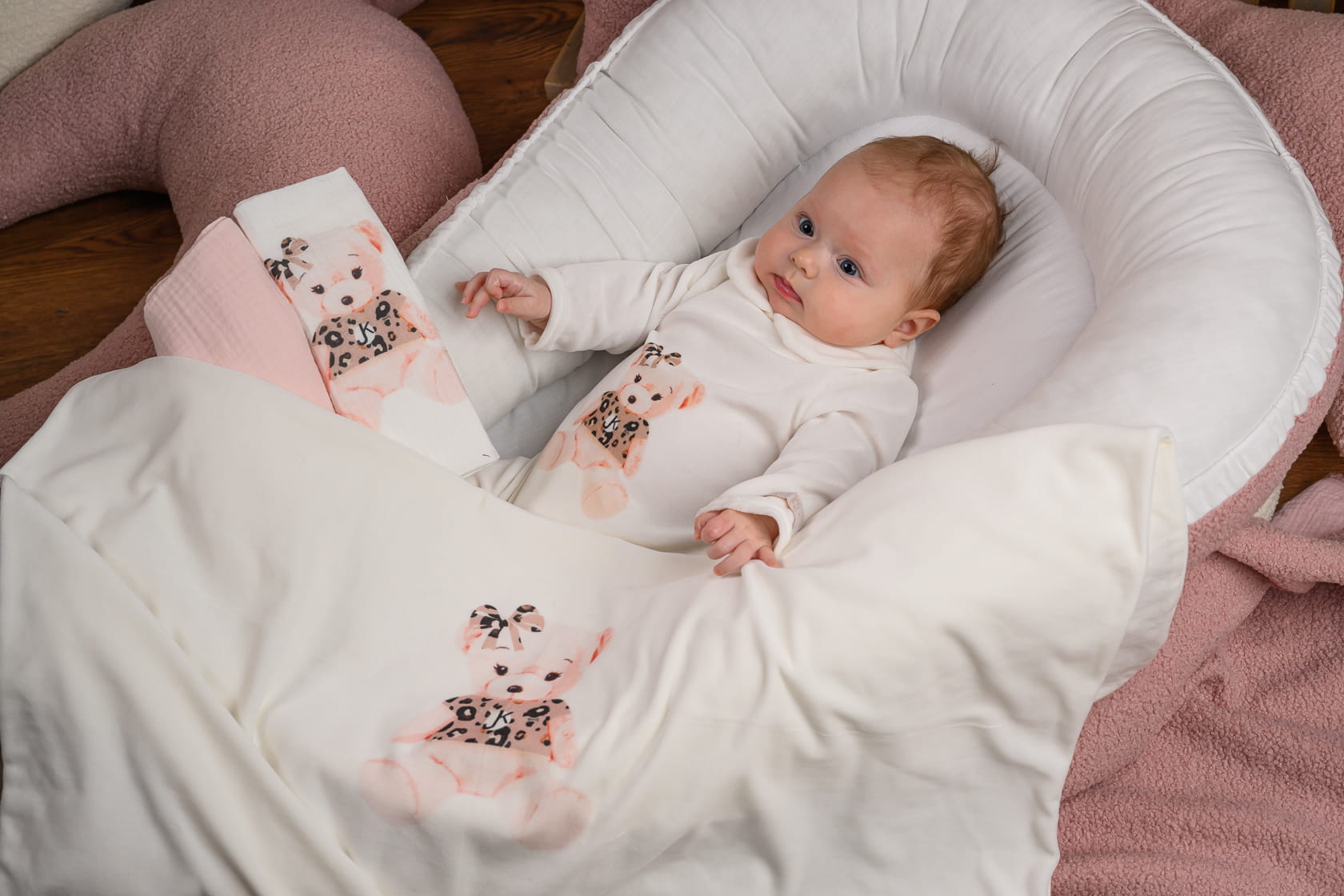 Jedna z pieluszek jest jednokolorowa, dzięki czemu może pełnić rolę klasycznej i uniwersalnej pieluszki, idealnej do codziennego użytku. Druga pieluszka jest ozdobiona uroczym nadrukiem, co nadaje jej dodatkowego uroku i może być atrakcyjna dla maluszka.