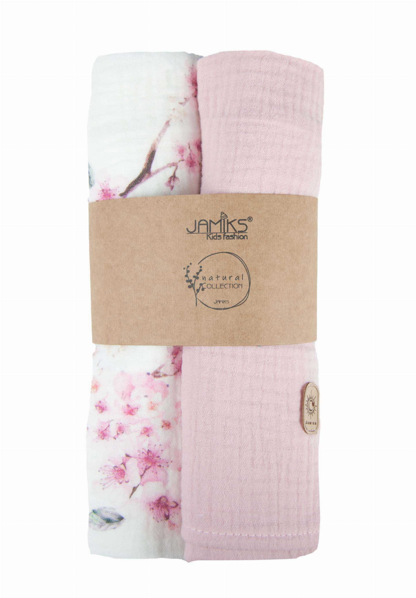 W skład zestawu wchodzi pieluszka ekri z nadrukiem kwiata wiśni oraz gładka pieluszka w kolorze różowym.