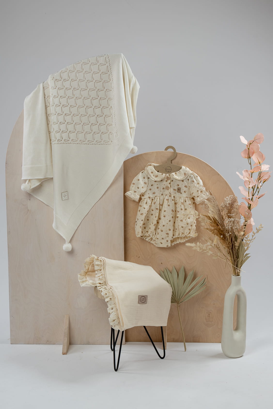 Rampers muślinowy dla dziewczynki SALAMANKA krótki rękaw ekri+brąz