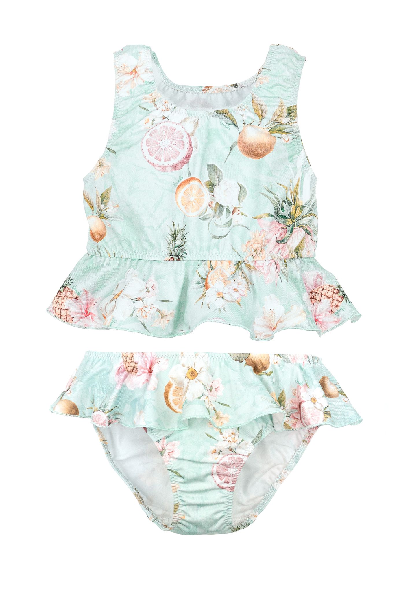 Góra stroju kąpielowego ozdobiona jest delikatną falbanką, dodającą mu dziewczęcego wdzięku i lekkości. Wykonana z najwyższej jakości materiałów, ta góra stroju posiada specjalną powłokę chroniącą przed promieniowaniem UV SPF50, co sprawia, że dziecko może bezpiecznie i swobodnie bawić się na słońcu przez długi czas.