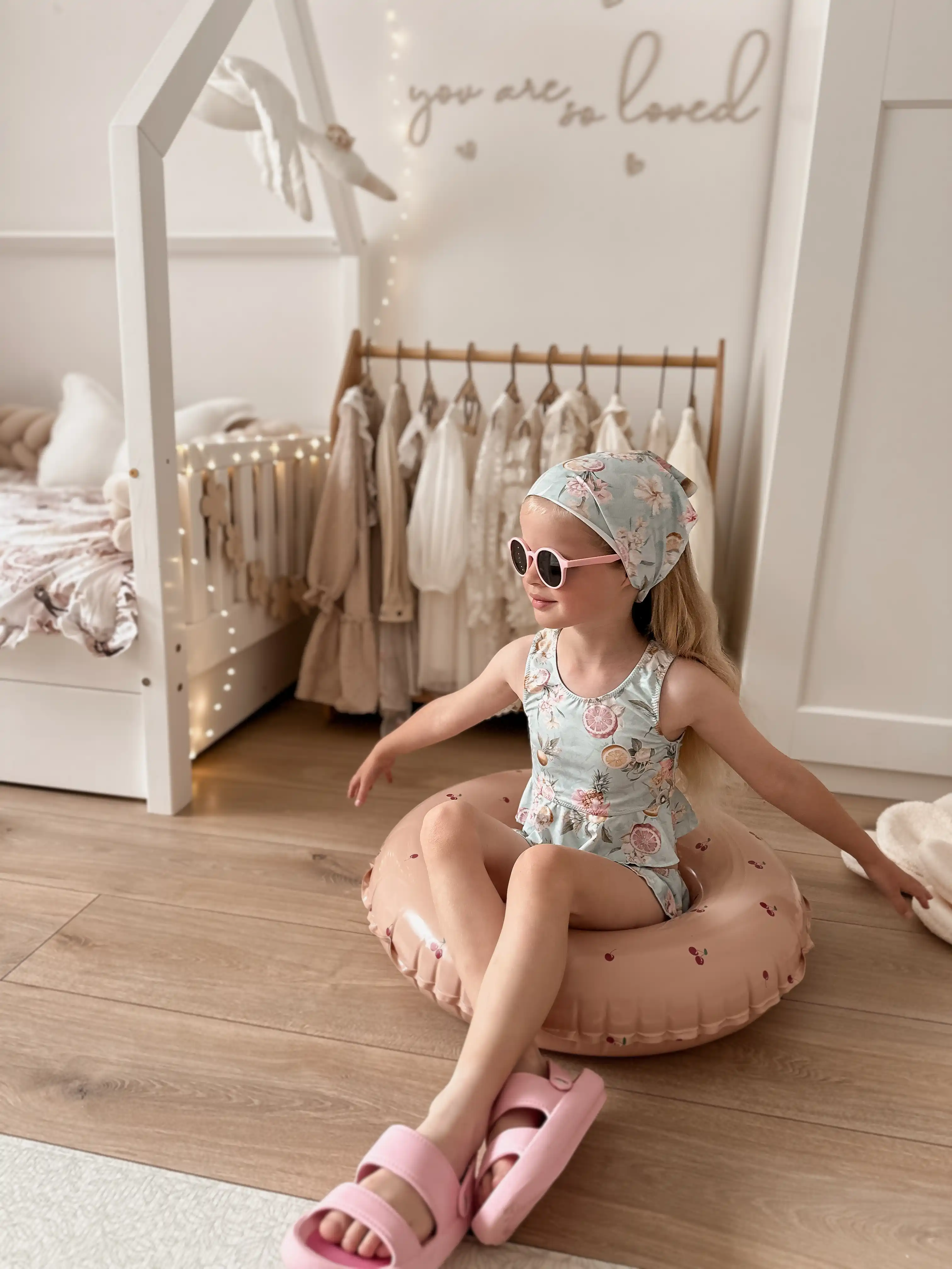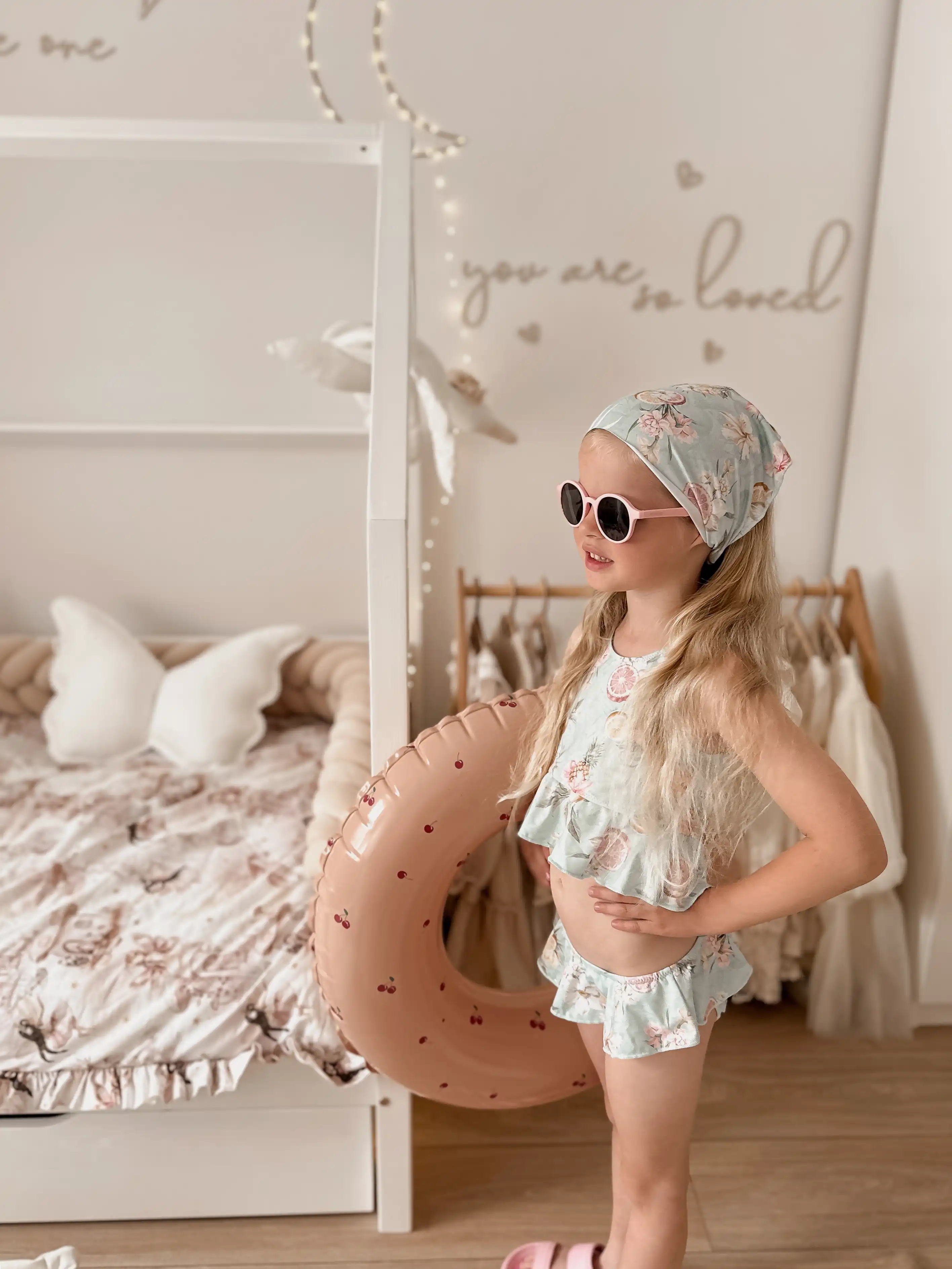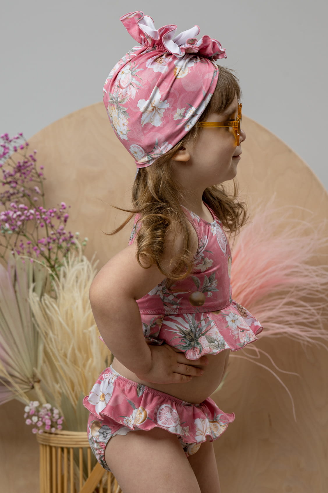 Cały materiał został udekorowany naszym autorskim printem, który przyciąga wzrok swoimi kolorami i wzorami, dodając niepowtarzalnego charakteru temu strojowi kąpielowemu. Dzięki temu każda mała fashionistka może poczuć się wyjątkowo i stylowo na plaży, prezentując swój niepowtarzalny styl.
