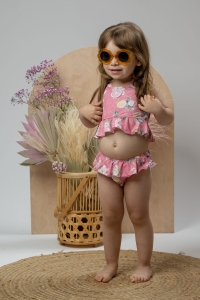 Góra stroju kąpielowego ozdobiona jest delikatną falbanką, dodającą mu dziewczęcego wdzięku i lekkości. Wykonana z najwyższej jakości materiałów, ta góra stroju posiada specjalną powłokę chroniącą przed promieniowaniem UV SPF50, co sprawia, że dziecko może bezpiecznie i swobodnie bawić się na słońcu przez długi czas.