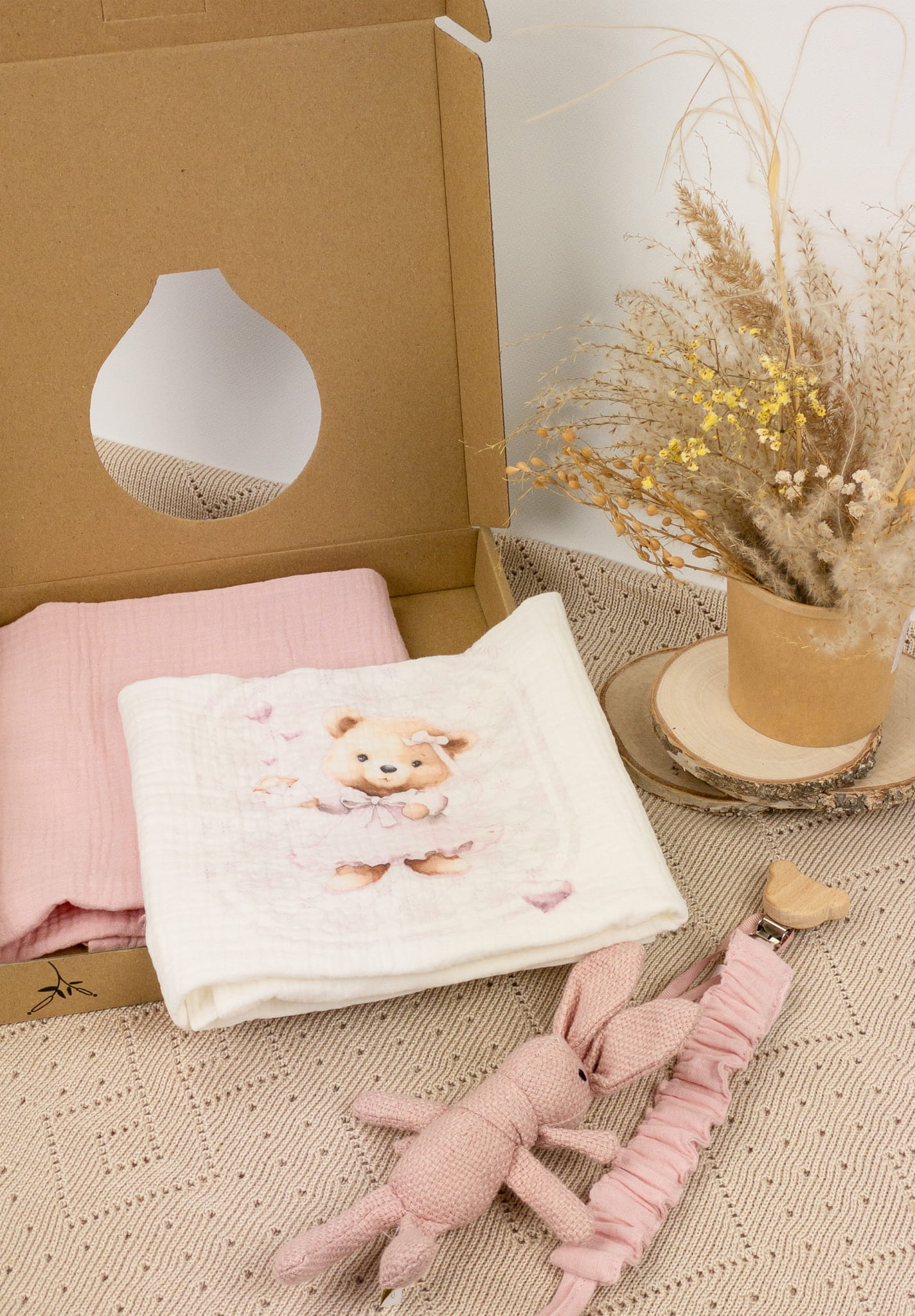 Naturalne materiały, stonowane kolory i staranne wykonanie sprawiają, że to idealny wybór na baby shower lub pierwszą wyprawkę.