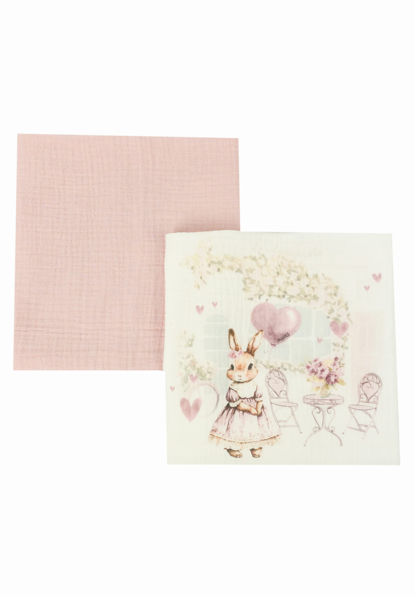 Dwie muślinowe pieluszki – delikatne, miękkie i oddychające, idealne do otulania, karmienia czy jako osłonka. Jedna z nich ozdobiona subtelnym nadrukiem. Wykonane z bawełny organicznej, która nie uczula, jest idealna dla bardzo wrazliwej skóry niemowlaka.