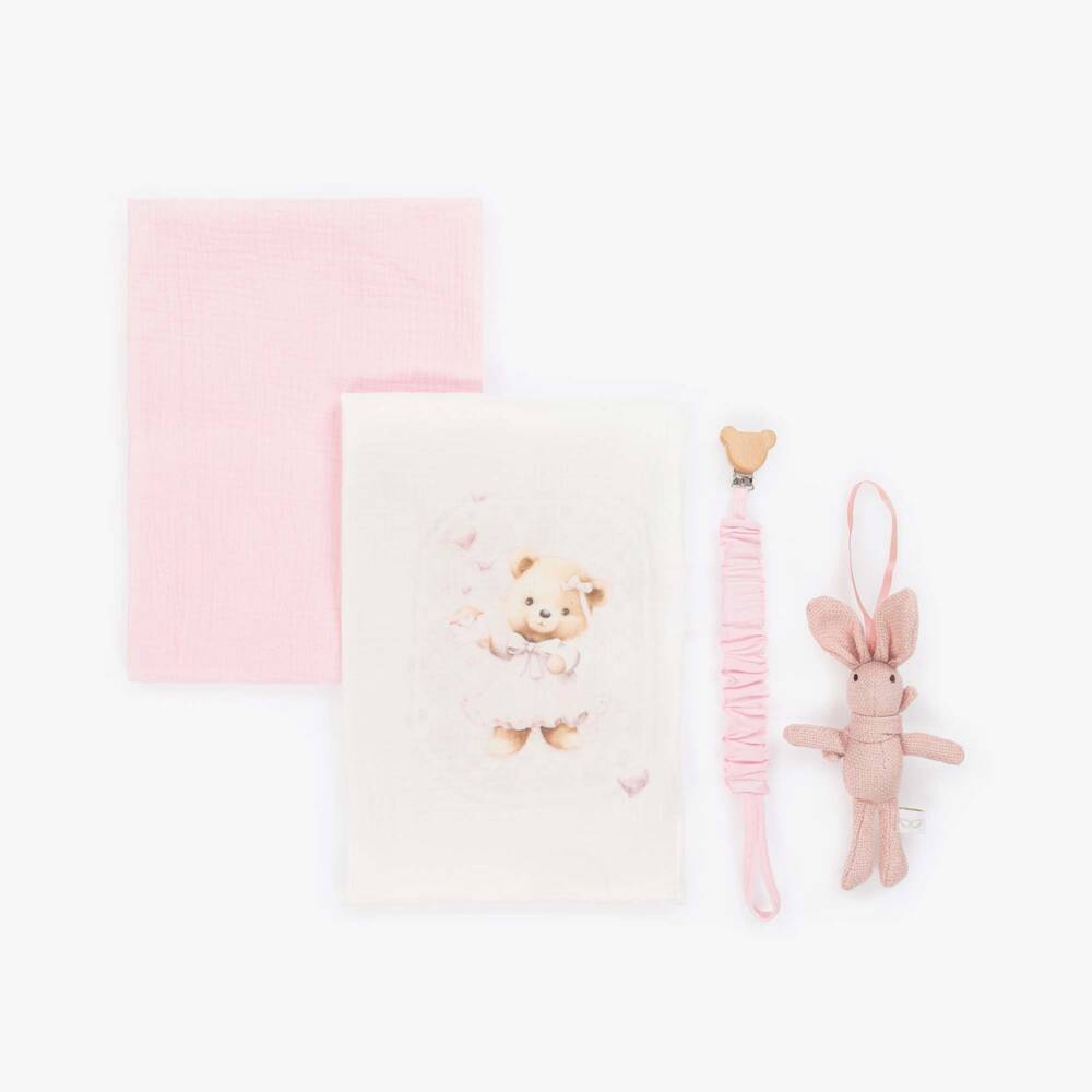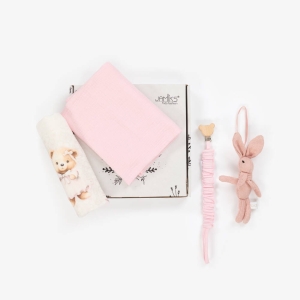 Zestaw pieluszki muślinowe + zawieszka do smoczka + maskotka LOU organic Róż Neia